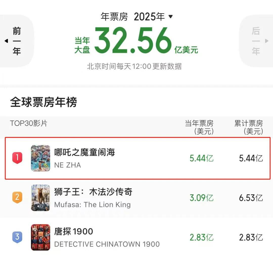 放眼國際,吒兒更是以5.44億美元(還在上漲中)拿下2025年全球票房榜TOP1。