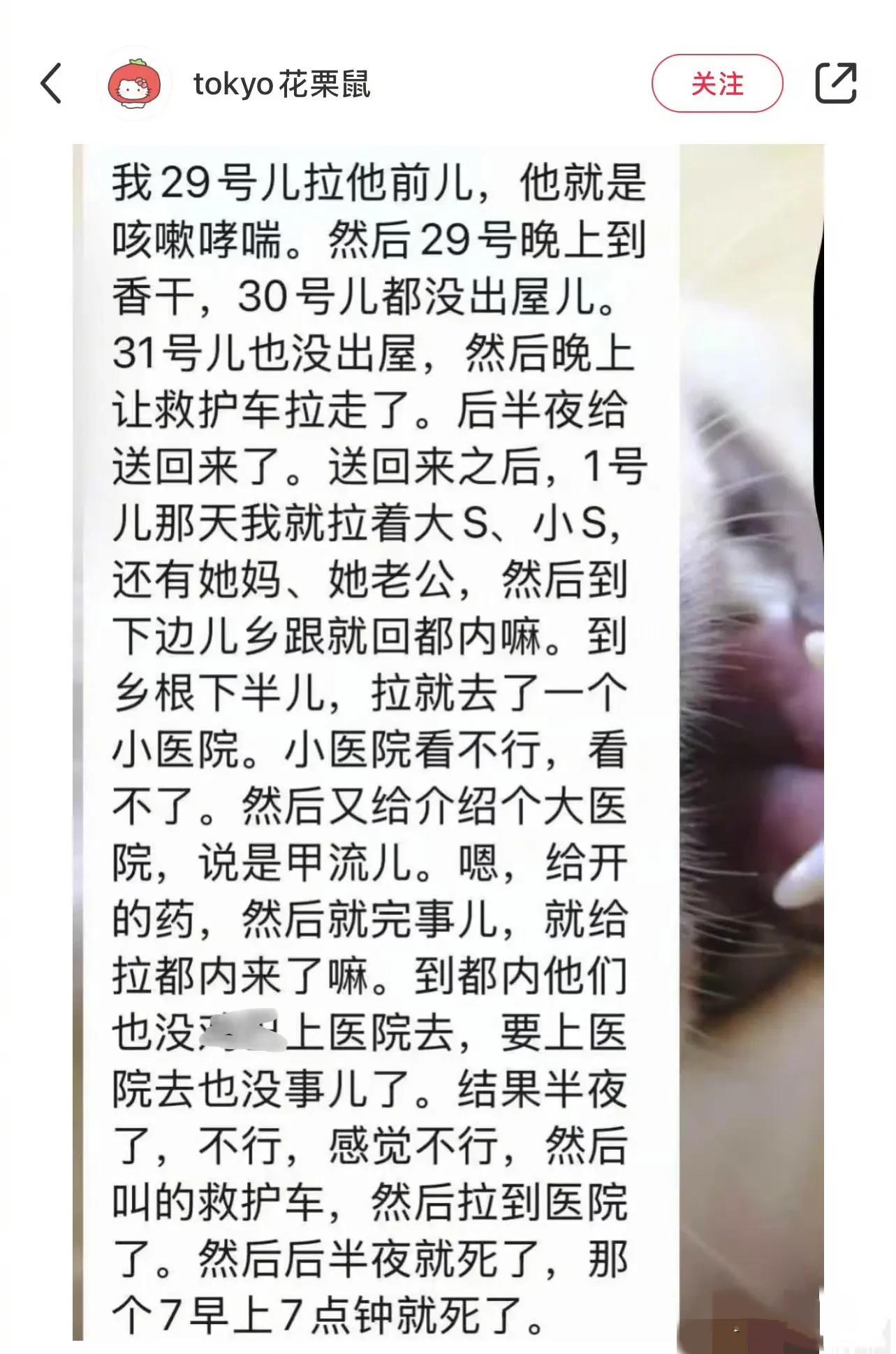 2月1日,大S去小醫院看病,確診了甲流,但醫院只給開了一些藥,沒做其他救護措施。到了晚上,大S病情急劇惡化,再次叫來救護車送往醫院,但已經無力迴天,大S於2月2日去世。