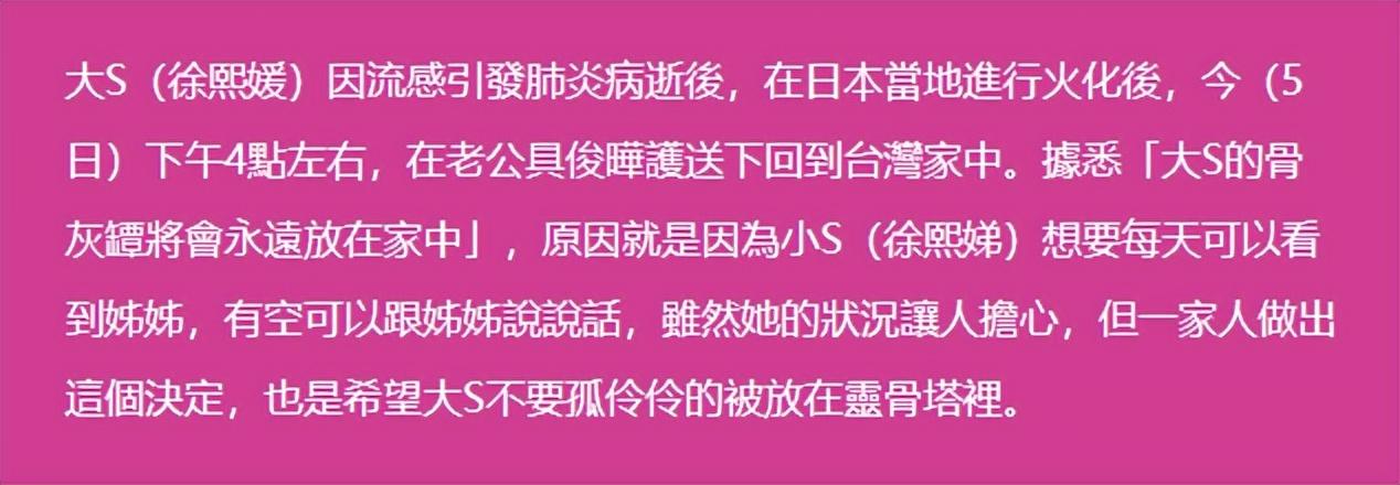 根據臺媒最新報道可知,大S的骨灰已經安置在家中,並且將永久放在家中。
