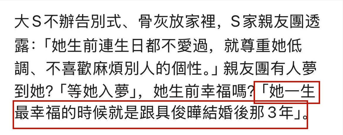 大S的家屬接受媒體採訪時直言大S人生最幸福的時光就是與具俊曄在一起的3年。