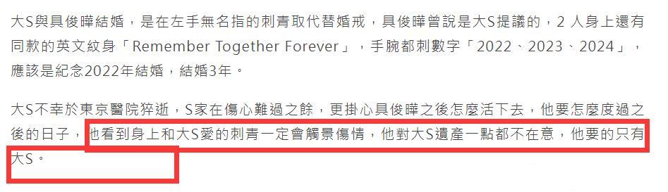 這也就是說他可以做到不要一分錢遺產。而在前幾日,大S的親友便曝光了具俊曄對遺產的態度。