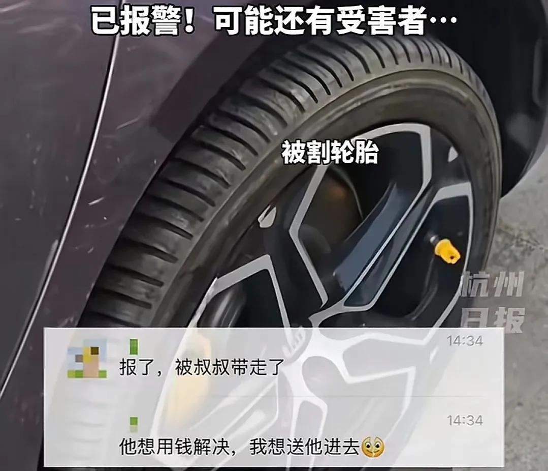 於是上完廁所,小米車主就出去看車,發現車胎被劃了。