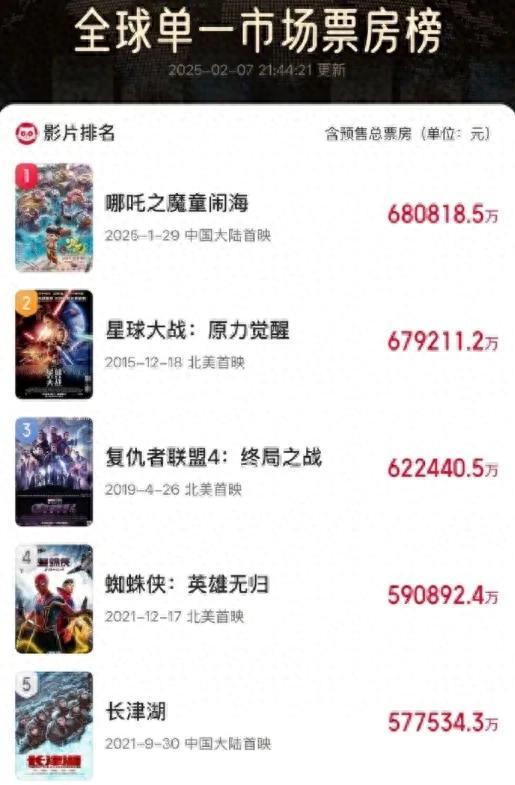 截至2月7日,已突破67億大關,超《星球大戰:原力覺醒》,登頂全球單一市場票房榜。