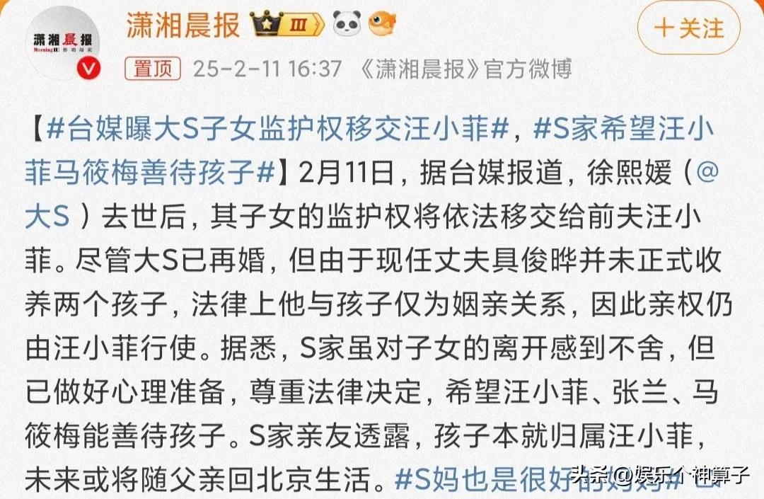 此外,S家把兒女監護權移交給汪小菲,同時也希望能與馬筱梅善待孩子,那麼,大S的媽媽第三次發聲,是否與汪小菲悄悄回家,把兒女留在臺北有關,就不得而知了。