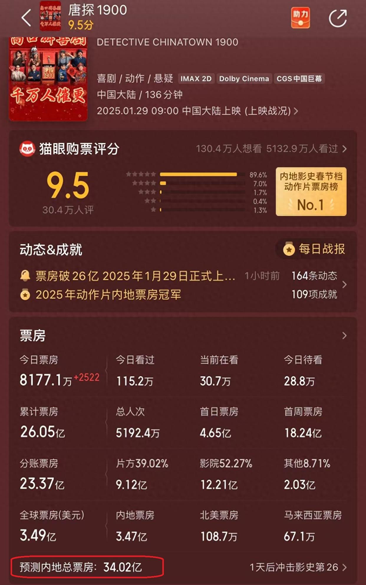《哪吒之魔童鬧海》最新的預估最終票房,達到了108億,中國電影即將進入“單片百億時代”。在此之前的春節檔,所有電影票房加起來,都不一定有100億。去年春節檔票房冠軍是34.17億的《熱辣滾燙》,而《唐探1900》生不逢時。如果《唐探1900》在去年春節檔上映,就是票房冠軍了。在《哪吒之魔童鬧海》這麼強勢的情況下,《唐探1900》最新的預估最終票房超過了34億,也算是創造奇蹟。
