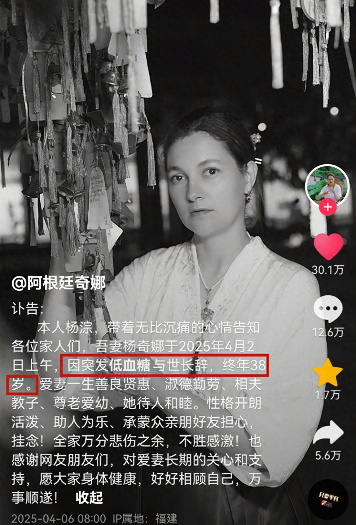 誰能想到,這麼一位善良、賢惠的洋媳婦,卻因爲突發低血糖,於2025年4月2日上午離世,年僅38歲。