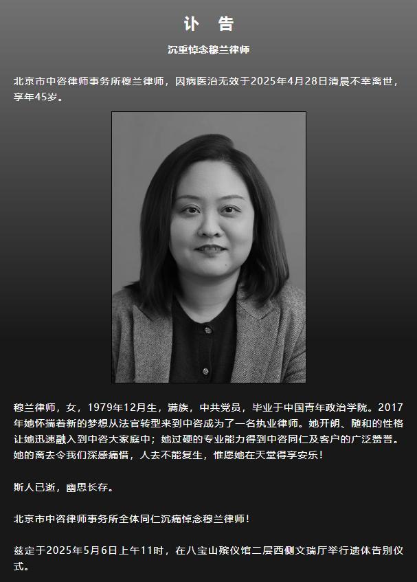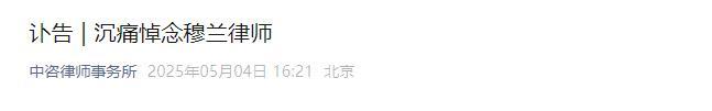 5月4日下午,穆蘭律師所任職的北京中諮律師事務所突發訃告,向外界告知了穆蘭律師去世的消息。