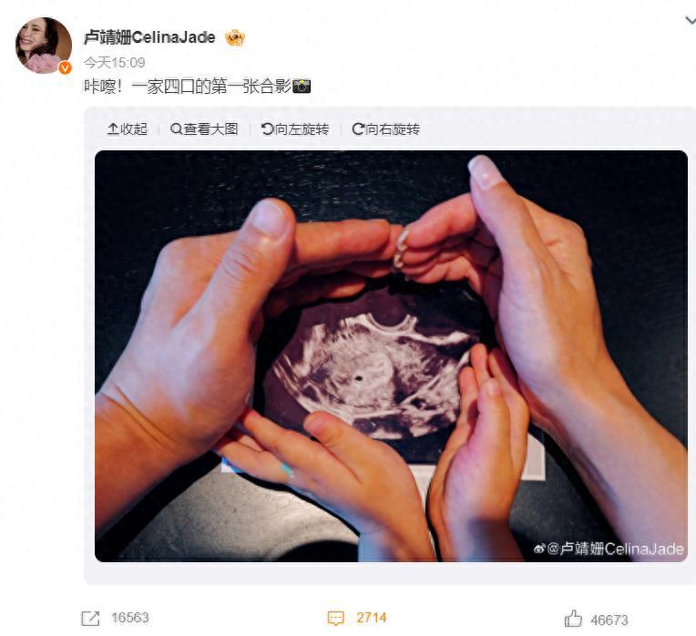 5月4日下午3點多,盧靖姍發文“咔嚓!一家四口的第一張合影”。配圖是盧靖姍、韓庚和他們的女兒用手圍着B超的照片。