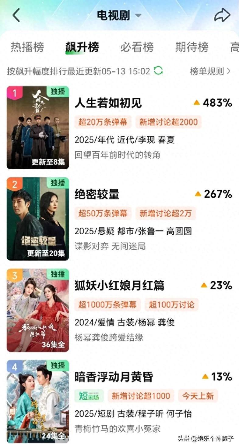 無論從主創方、劇情還是演員陣容看,《人生若如初見》都是上乘之作,加之製作精良、大劇質感和服道化還原度極高,播出後果然一騎絕塵,佔領平臺飆升榜榜首,好評不斷刷新,有望再掀年代劇收視狂潮。