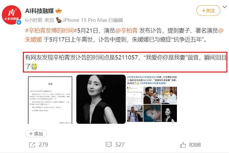 網友發現辛柏青發布妻子訃告的時間大有含義,隱藏着辛柏青對妻子的愛。