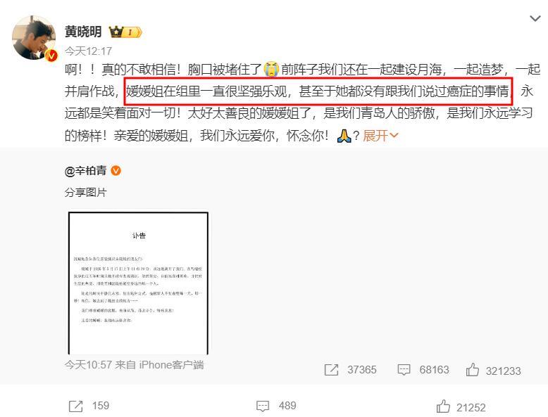 辛柏青在訃告中寫道妻子患病之後,沒有消極悲觀,而是自信的面對困難,並把對生活的熱愛、用歡笑和溫暖傳遞給身邊的每一個人。