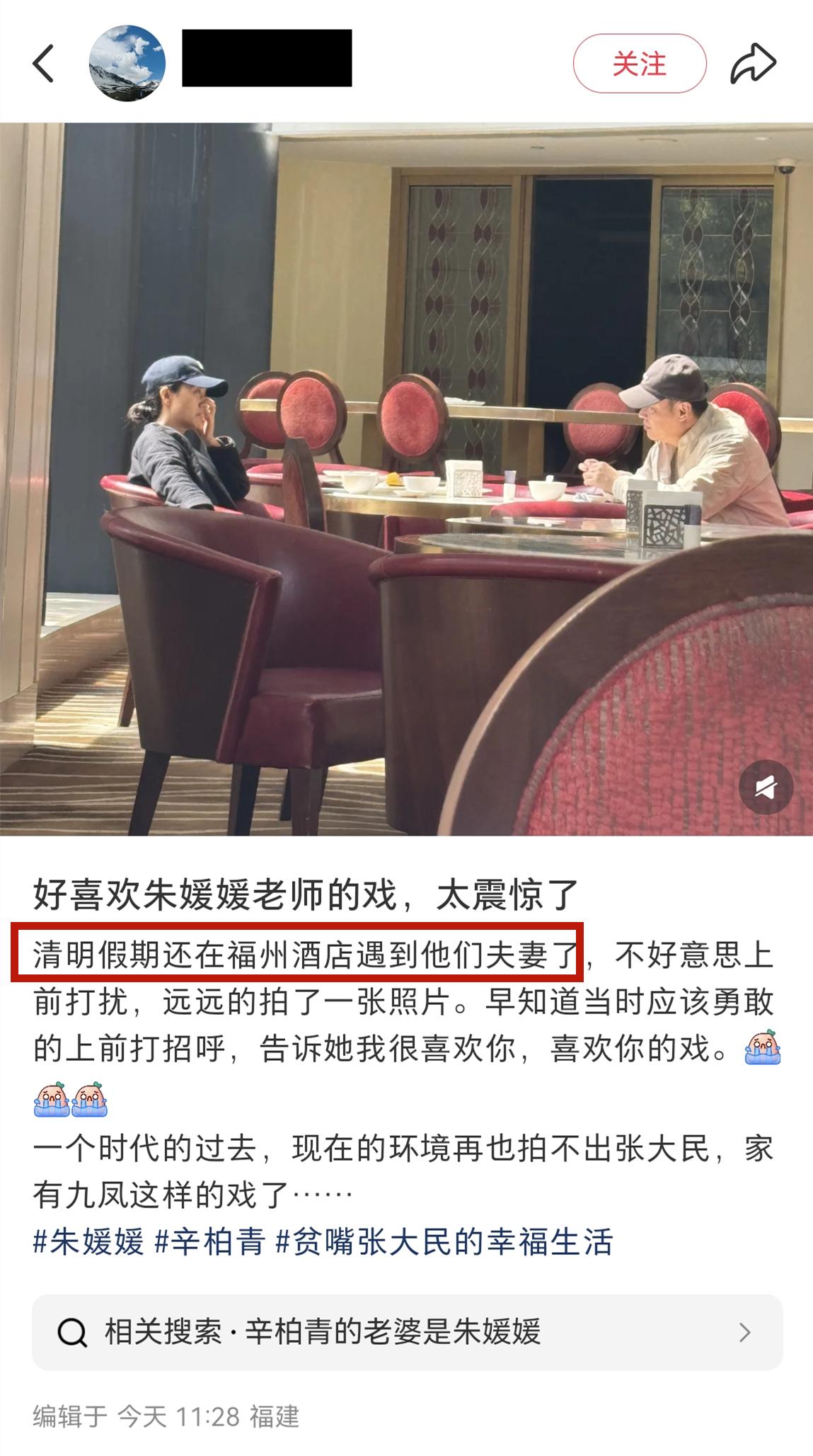 這位網友說她在今年清明節假期在福州的一家酒店遇到了辛柏青和朱媛媛,從該網友曬出的照片中可以看到,朱媛媛和辛柏青是在酒店的餐廳裏,夫妻倆面對面的坐着,一邊喫飯一邊聊天。
