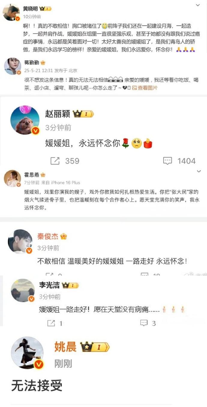 目前,娛樂圈已經有數十位明星發文悼念朱媛媛,他們有姚晨、易烊千璽、劉浩存、李靜、趙麗穎、黃曉明、馬伊琍、秦海璐、夏雨、岳雲鵬、梁冠華、孫紅雷、張子楓等人。