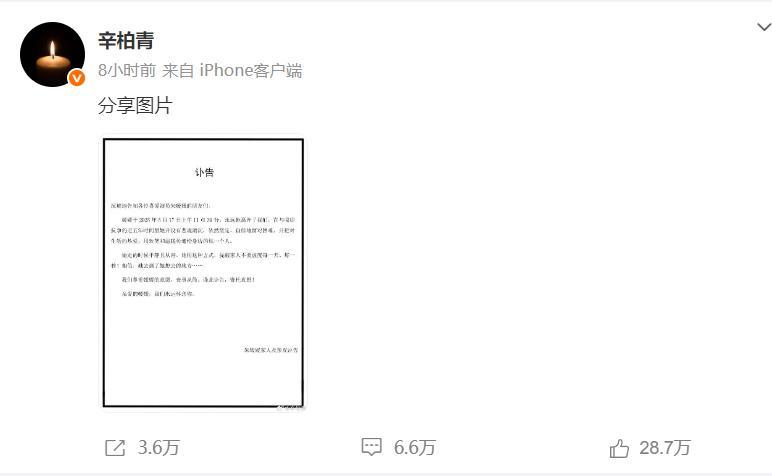 5月21日上午10點多,辛柏青突然在社交賬號上發佈了有關妻子朱媛媛的訃告。
