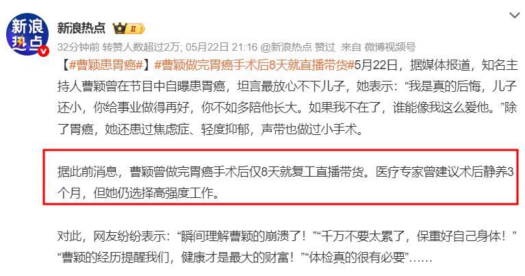 曹穎自曝患胃癌,放心不下年幼的兒子,術後8天直播帶貨引爭議