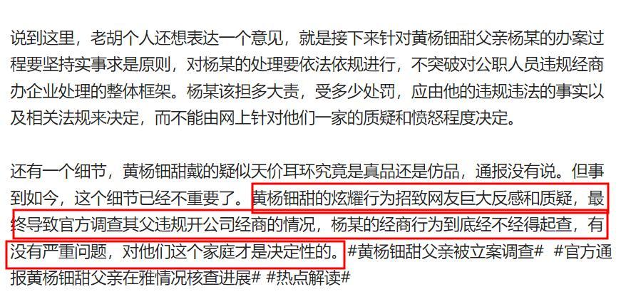 果然有問題!黃楊鈿甜父親被立案調查,胡錫進道出其結局關鍵因素