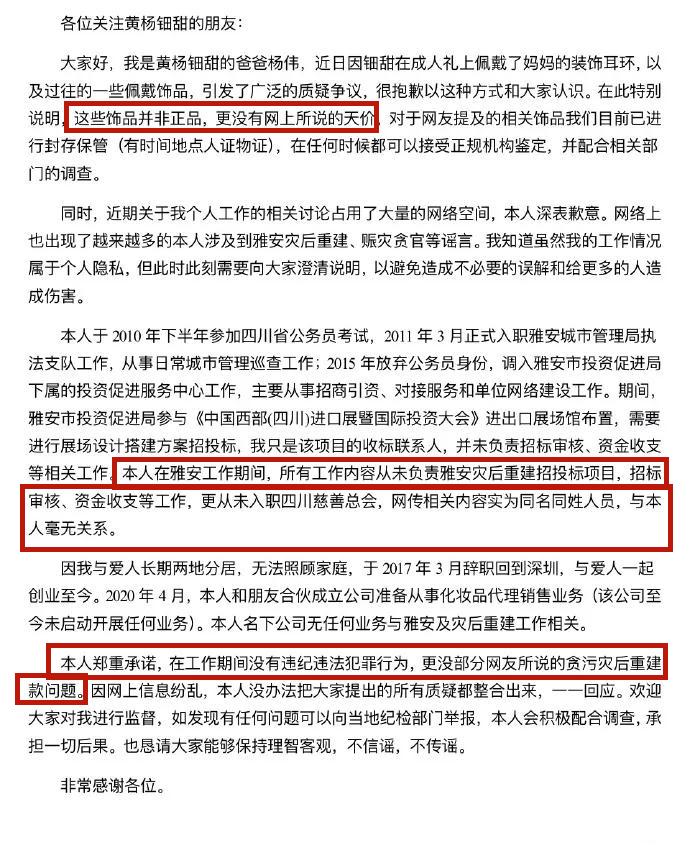 隨後,黃楊鈿甜的父親親自發文回應了。