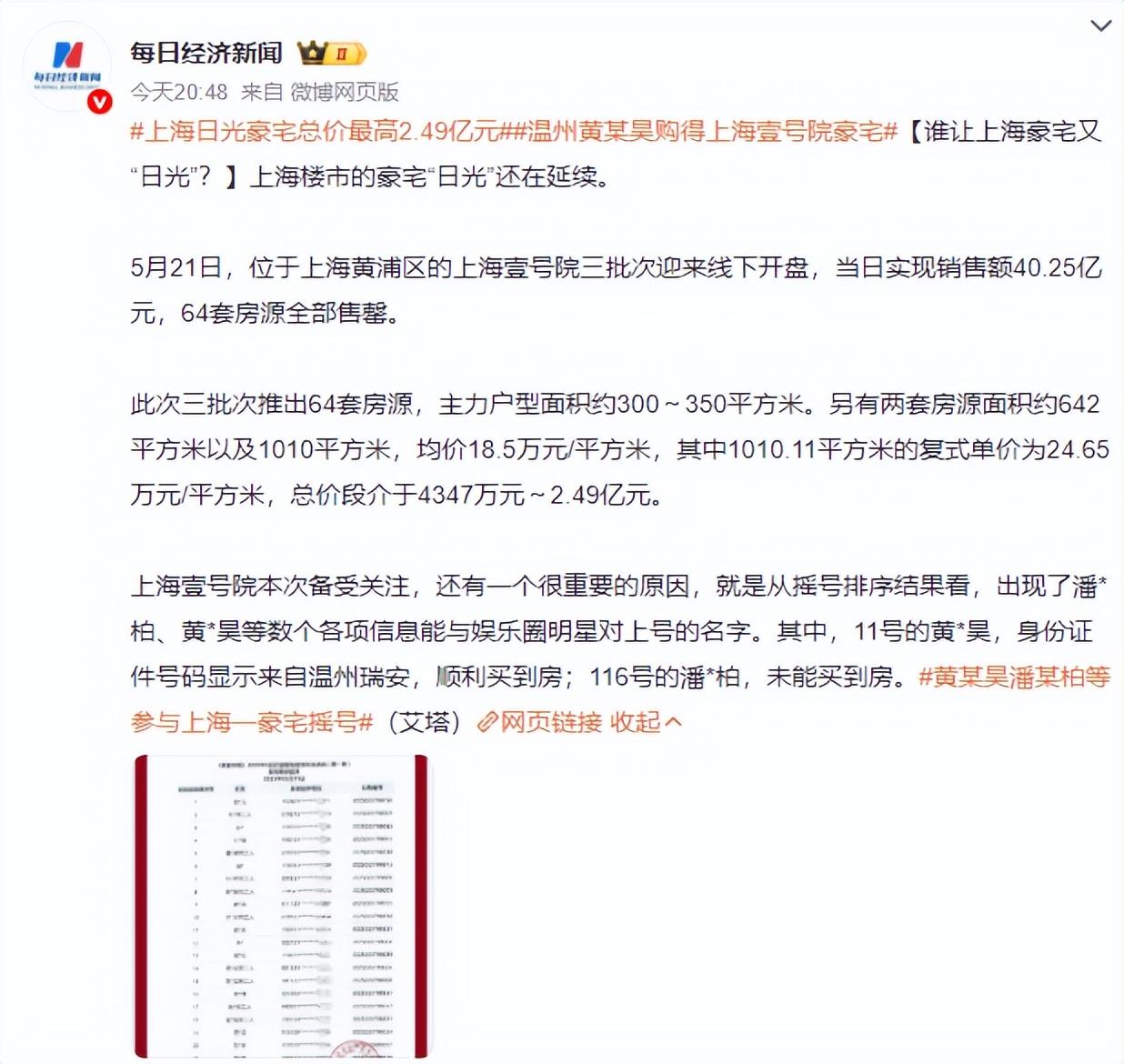 但上海的這個某號院卻需要搖號才能買,而它這次之所以引起巨大關注,是因爲該豪宅曝光了搖號的業主名單,而名單裏疑似有多位明星。