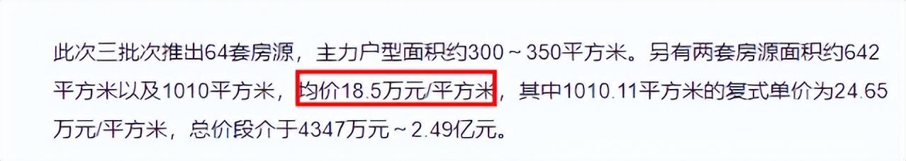 而且該豪宅還有1010.11平方米的複式,價格爲24.65萬元每平方米,要想拿下最大面積,得拿出2.49億元。