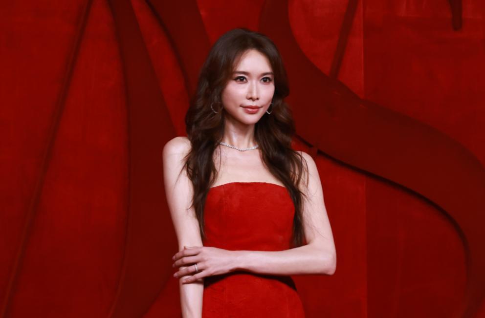 這次參加芭莎盛典,林志玲穿了一身紅色絨面開衩禮服,弄了一個小波浪的髮型,戴着心形銀色耳環。