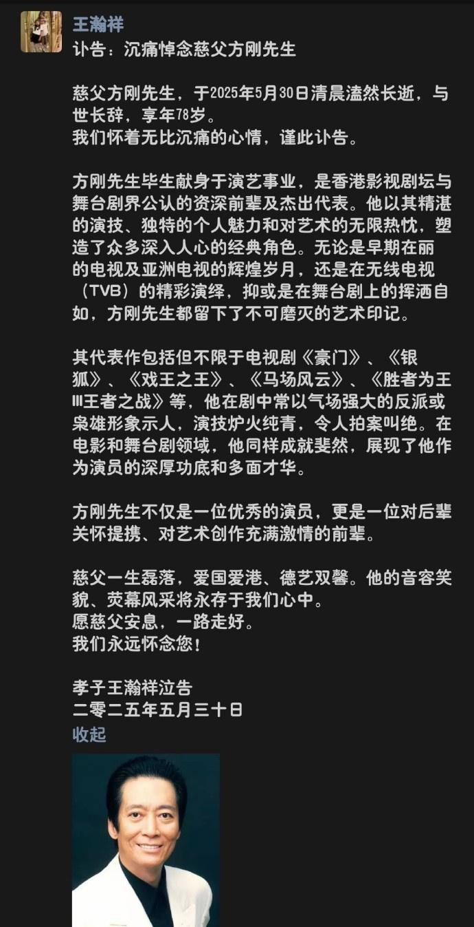 端午節假期的第一天,娛樂圈突傳噩耗,著名香港演員方剛離世,享年78歲。