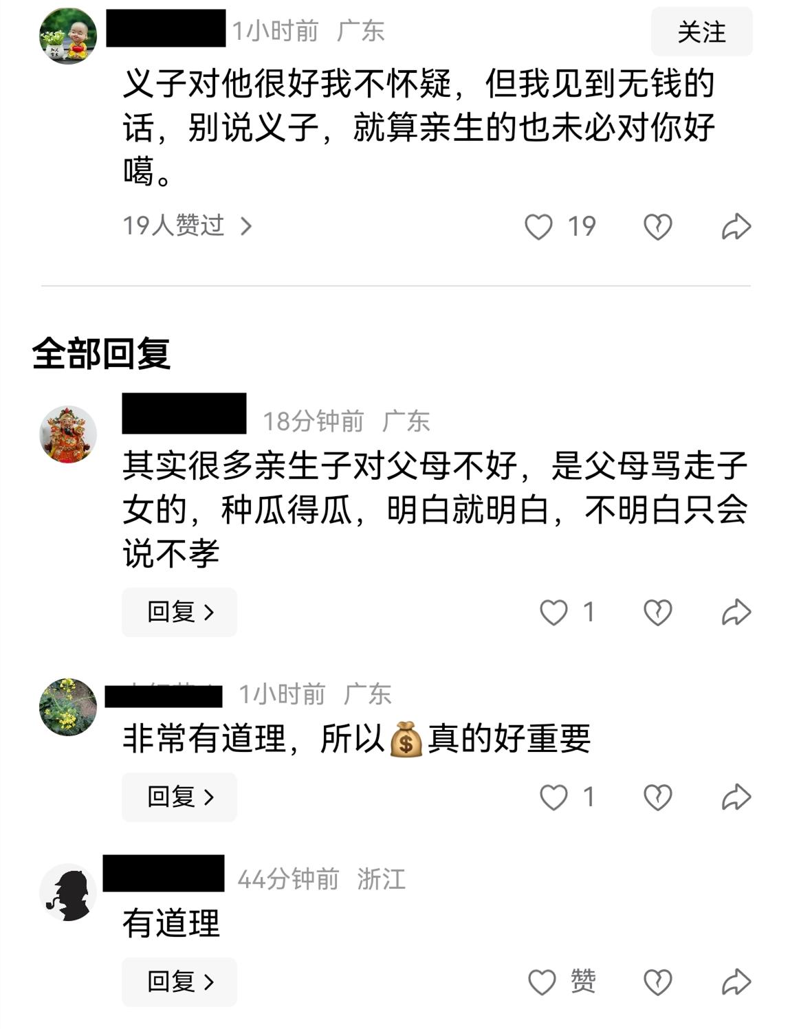 甚至有網友說“義子對他好我不懷疑,但沒錢的話,別說義子,就算親生的也未必對你好”,其他網友紛紛附和認同。