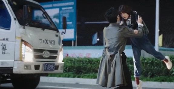 眼看着女主就要撞車,男主一把將女主甩到飛起,然後兩個人一塊往後退。