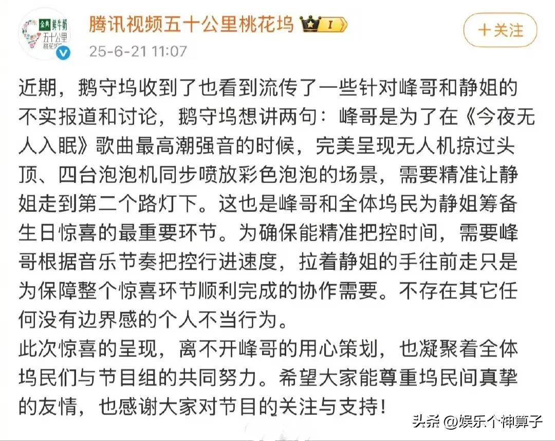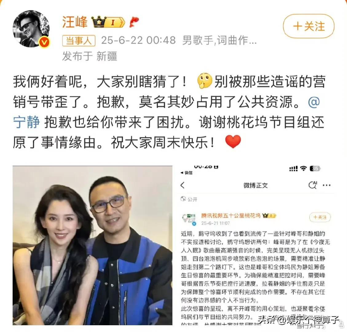 緊接着,汪峯對於此事給寧靜帶來的困擾表示歉意,間接的澄清了戀情傳聞,爲了更有說服力,還特意分享了節目組還原事情緣由的博文,鬧了半天,只是一場誤會,都是爲了配合節目效果。