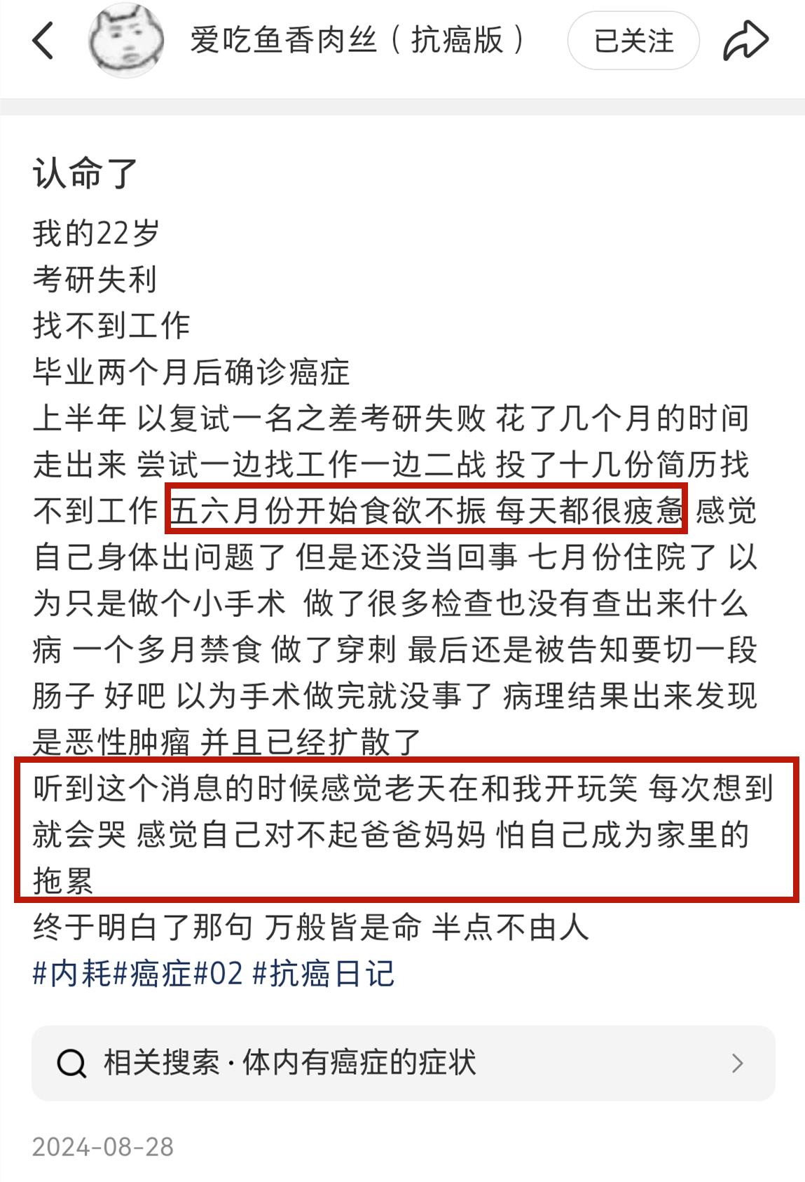 然而令人沒有想到的是,她大學才畢業2個月,也就是24年8月的時候她確診了腸癌晚期。
