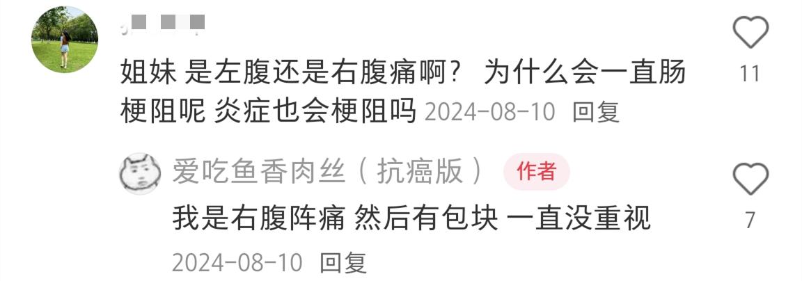 在確診之前的五六月份,她出現食慾不振、每天都很疲憊,以及右腹鎮痛等症狀,7月份她就開始住院,做各種檢查,最終在8月確診了腸癌晚期。