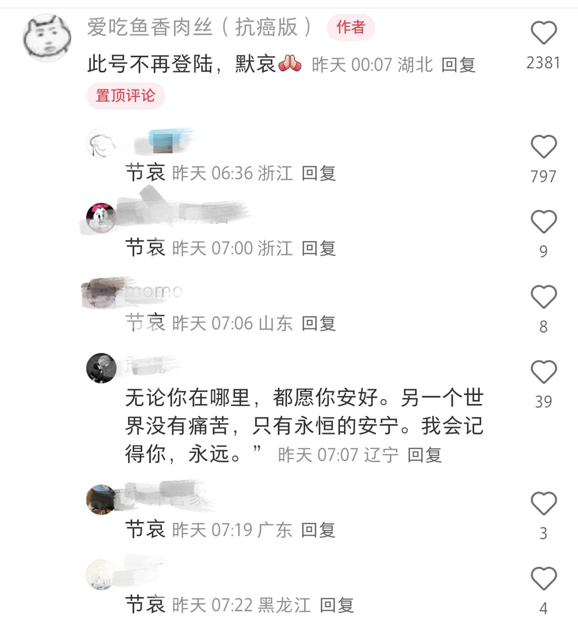 在評論區,魚香肉絲的家人表示以後不會再登錄魚香肉絲的這個賬號。