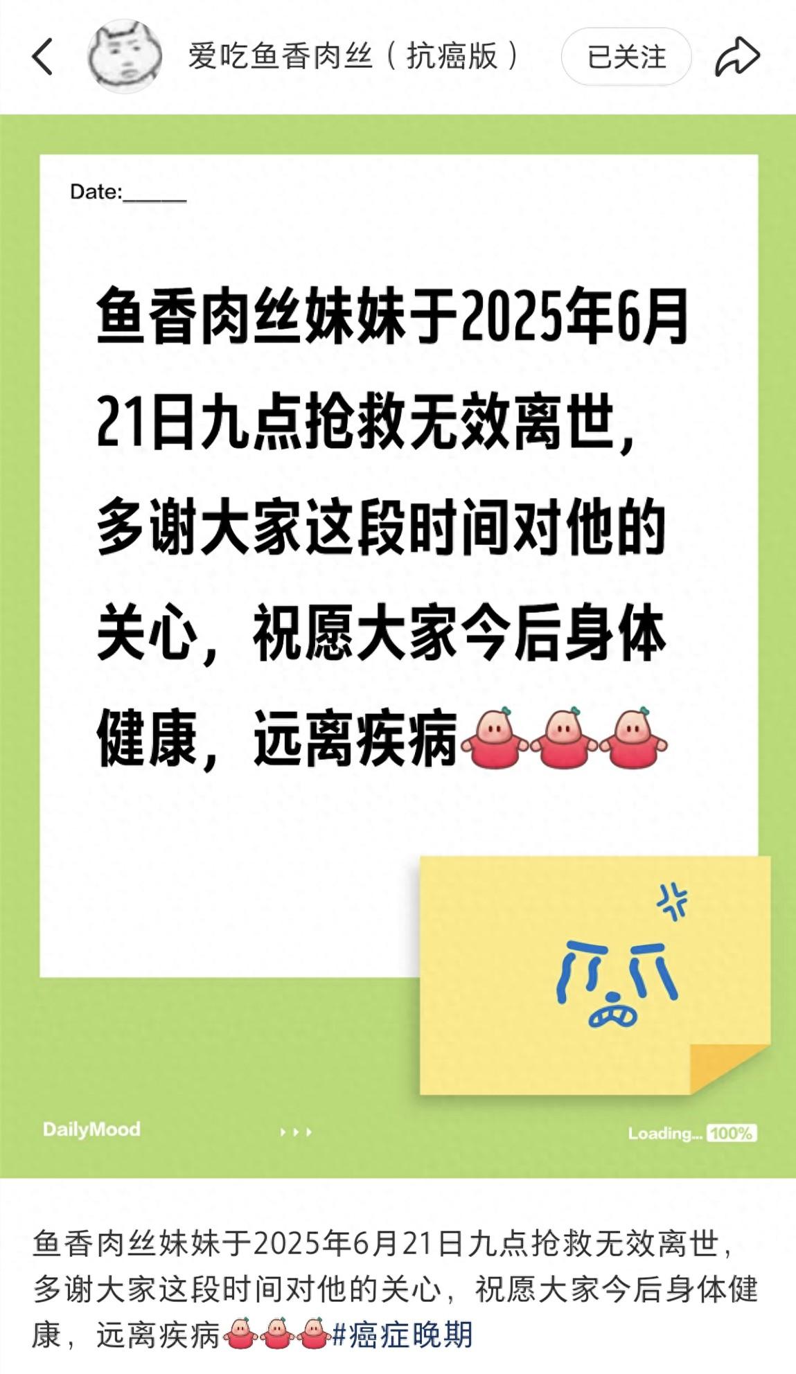 但病魔太殘酷了,發完這篇帖文8天后,魚香肉絲永遠地離開了這個世界。