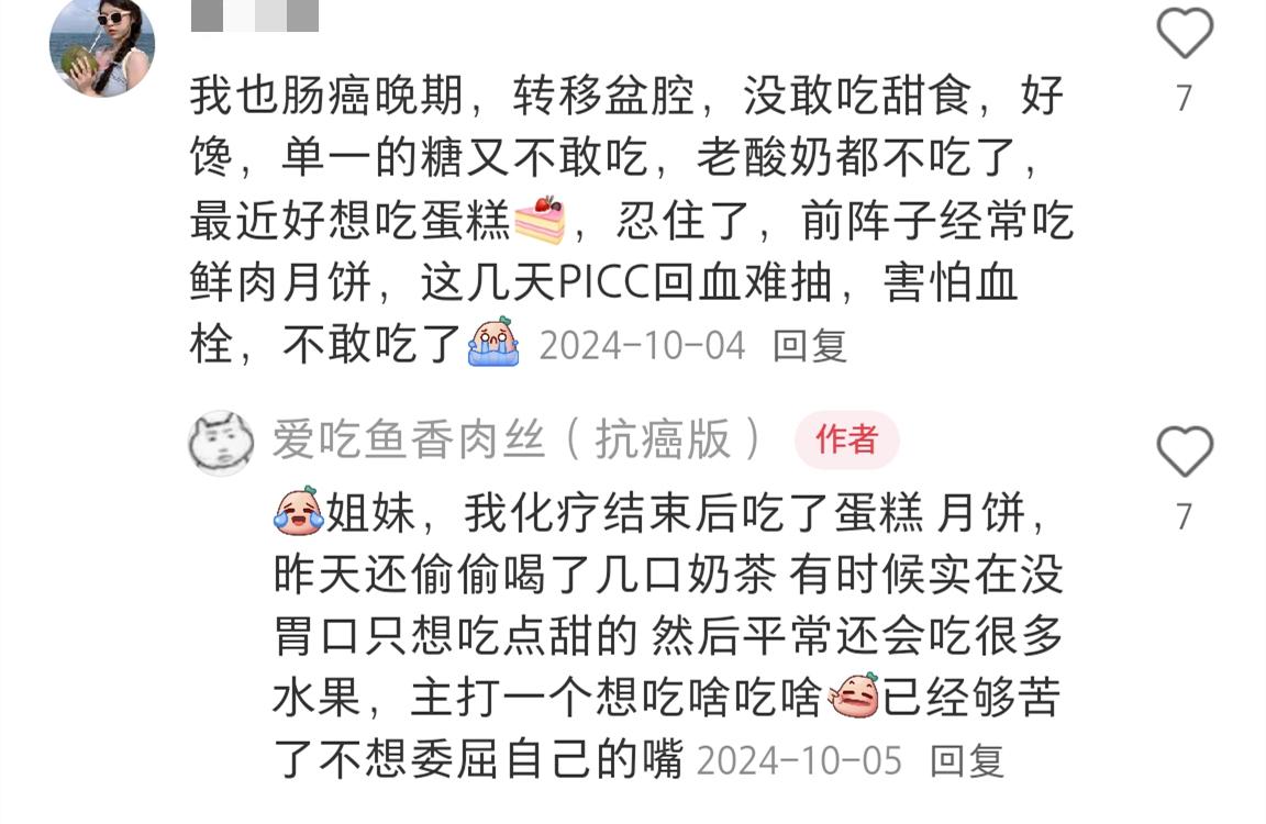 她也展現了她對美食的喜愛,在抗癌的過程中,她記錄了多次喫到美食的經歷,有網友得知她喜歡喫美食,還給她寄好喫的。