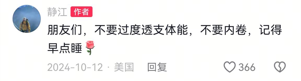 “朋友們,不要過度透支體能,不要內卷,記得早點睡。”