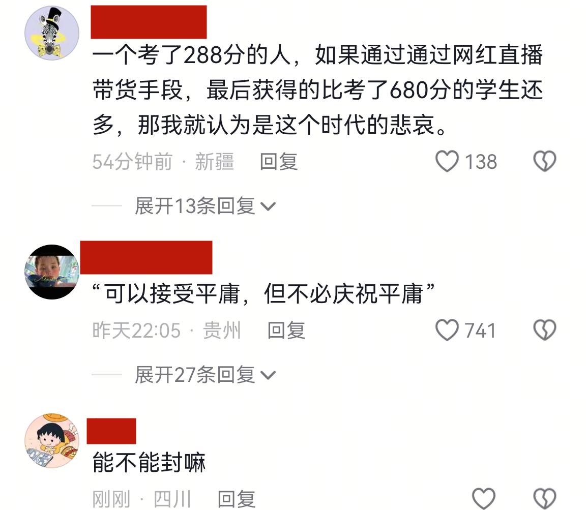 有網友說利用高考低分炒作成網紅帶貨,對其他好好學習的學生會產生不良的影響。