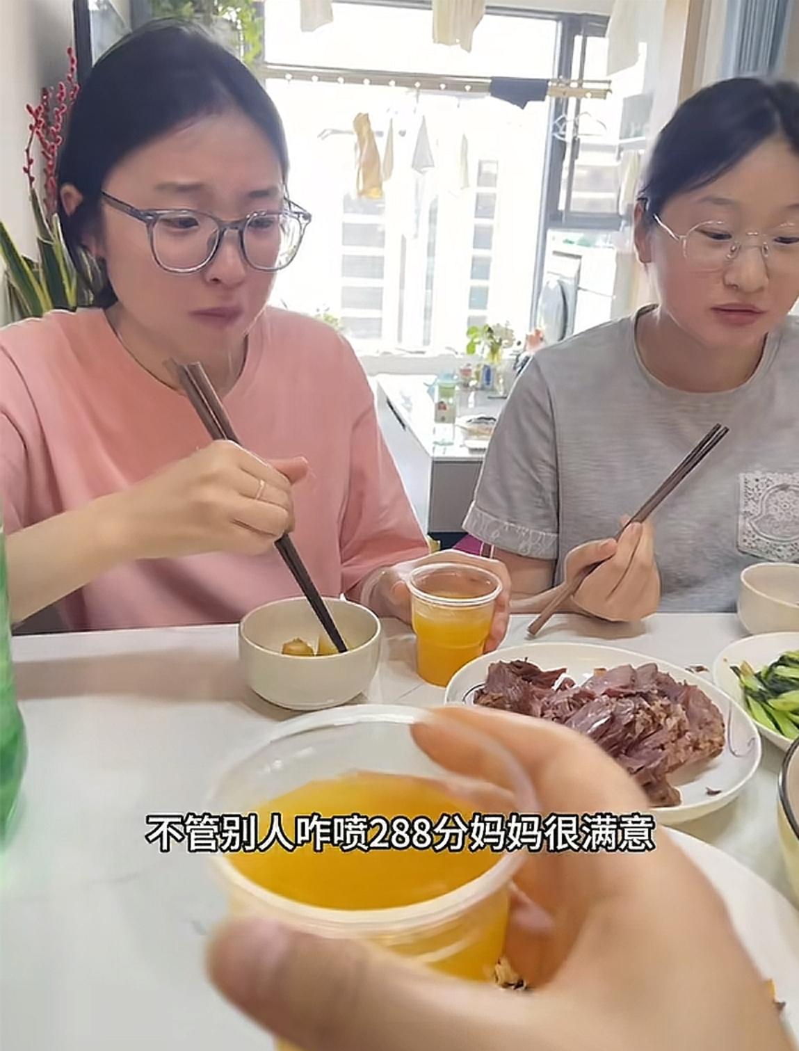 面對一些不友好的評論,蘭姐再發了一條視頻,視頻中她爲女兒做了一桌好菜。在喫飯時,她對女兒說不管別人怎麼噴288分,她都很滿意。