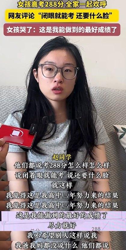 面對這些不友好的言論,288分女孩在接受媒體採訪時哭了,她說網友們說的很難聽,她說父母都沒說她,網友們卻都說她。