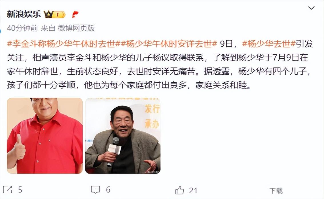 根據李金斗透露的信息,楊少華是在家中午休時離世,生前狀態良好,去世時安詳無痛苦。