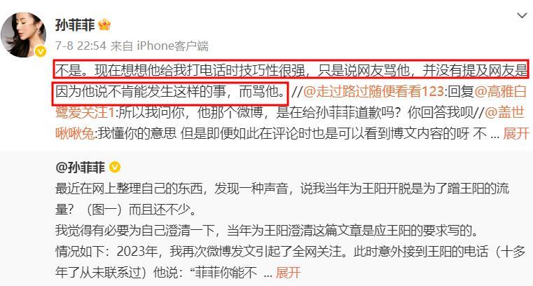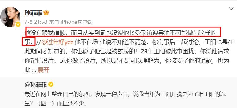 7月8日晚在與網友互動時,孫菲菲直言回想當初王陽給她打電話,王陽技巧性很強,因爲他只說網友因爲她的事情罵他,但沒有說是因爲他偏袒導演而罵他。