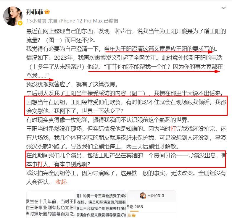 孫菲菲在長文中說在她發博引起關注後,已經十幾年沒有聯繫的王陽突然給她打了一個電話,說他因爲她的事情被罵了,希望她能發文幫他澄清一下。