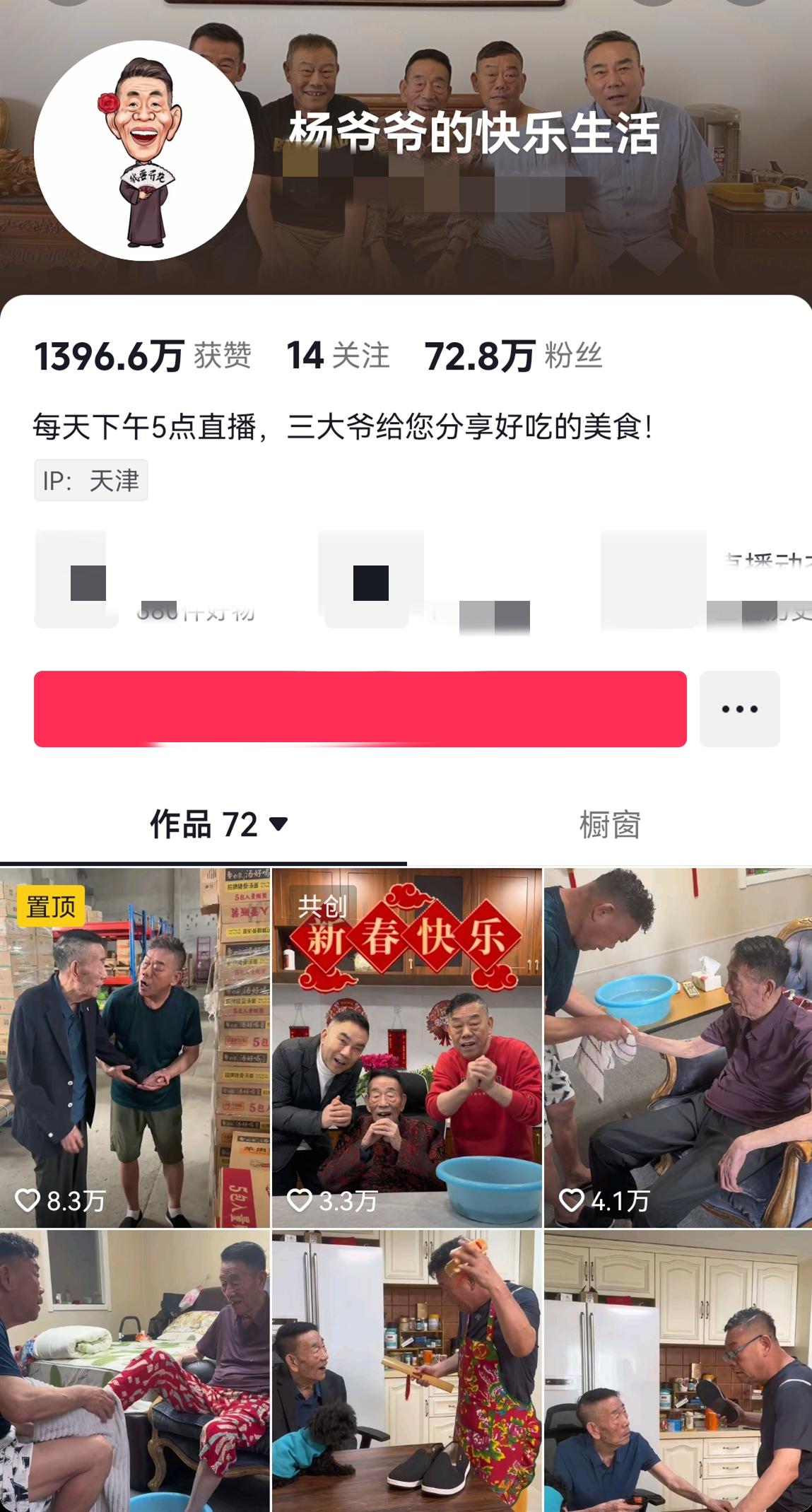 “楊爺爺的快樂生活”賬號原本有1700多條視頻,如今只有72條視頻可見,其他視頻要麼被刪除要麼被隱藏。