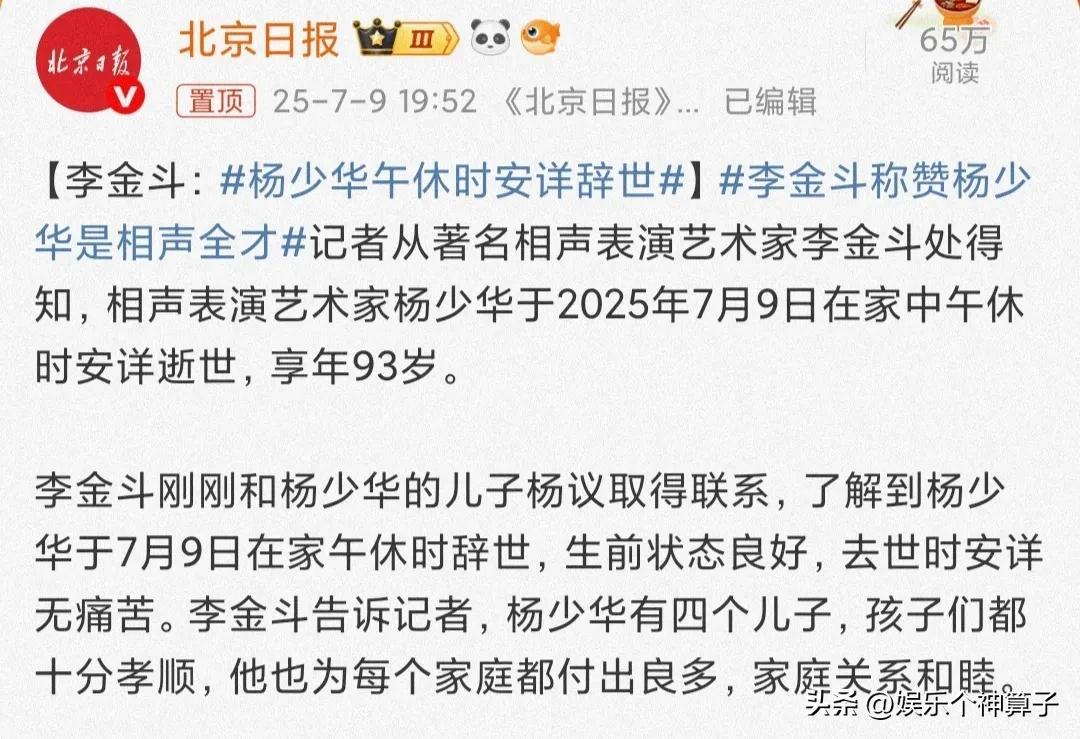 楊少華94歲的高齡,安詳離世,希望家人可以節哀,畢竟生活還要繼續,老爺子曾給觀衆帶來無數的歡樂,願逝者安息,一路走好!