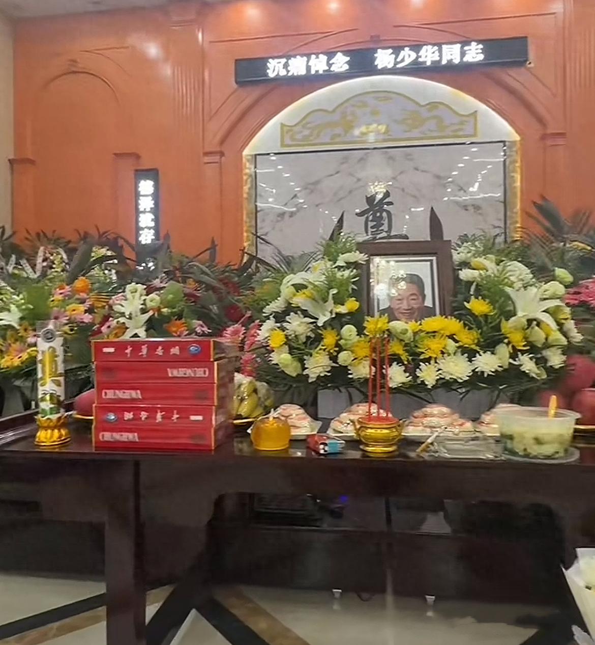 楊少華面帶微笑的遺像擺在靈堂的正中央,在遺像兩旁的電子屏幕上寫着輓聯:慈顏已逝、風木與悲,德澤猶存、音容宛在。