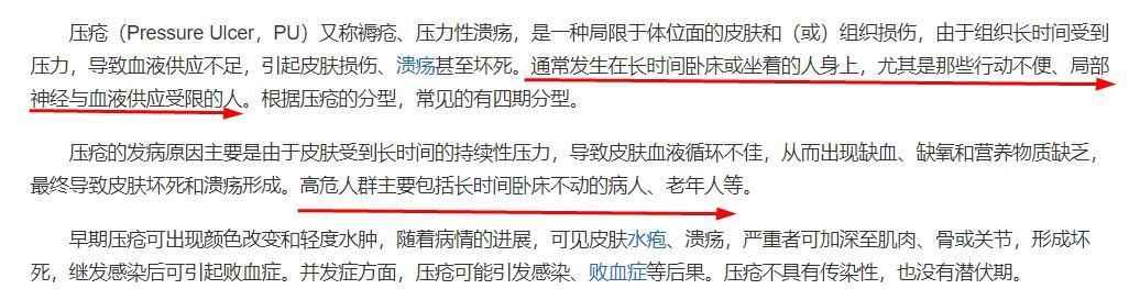 根據醫學資料中的解釋,壓瘡經常發生在長時間臥牀或坐着的人身上,尤其是那些行動不便、局部神經與血液供應受限的人。