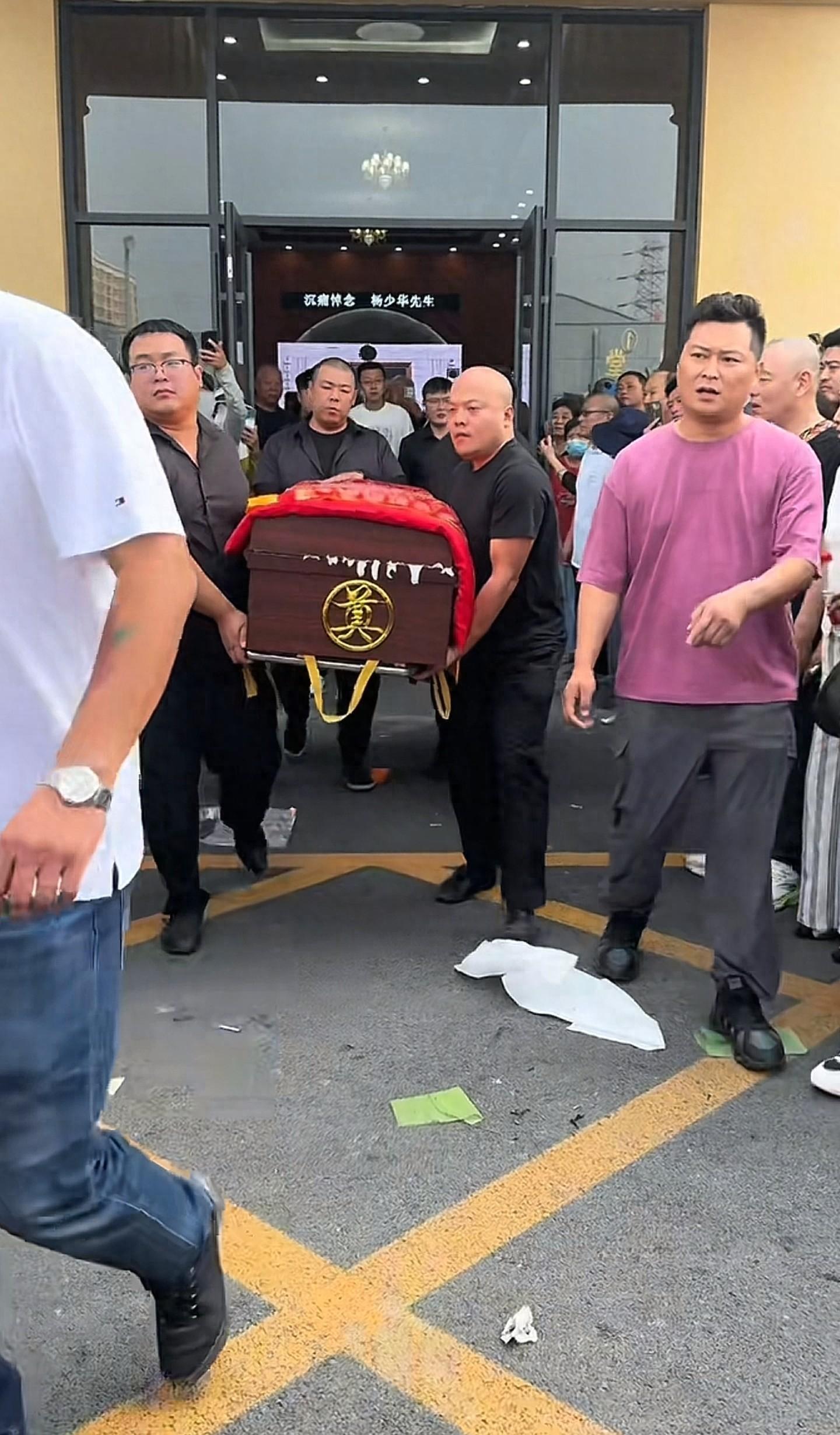 從視頻中可以看到,楊少華的棺槨被擡出殯儀館後,他的大兒子楊威摔盆打幡。