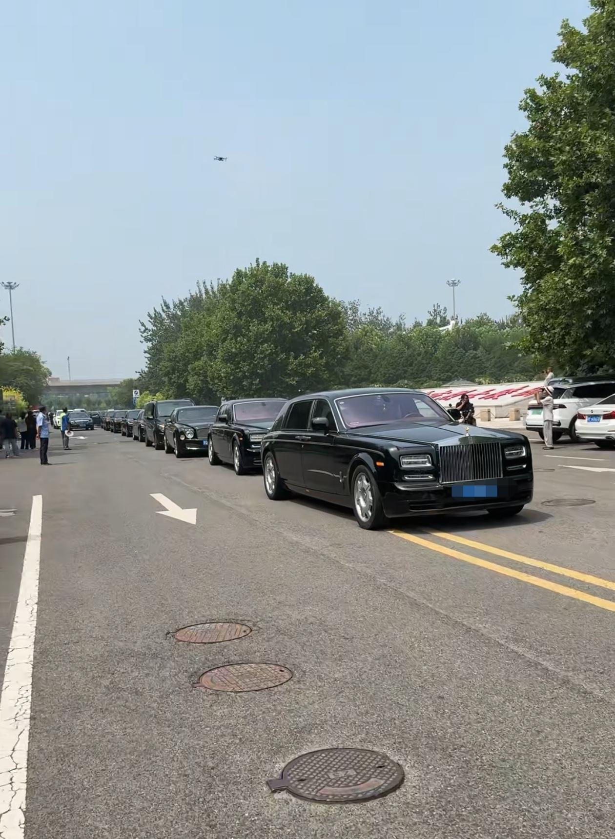 從現場視頻中還可以看到,送行車隊延綿數百米,清一色的都是豪車,有勞斯萊斯、邁巴赫等車。