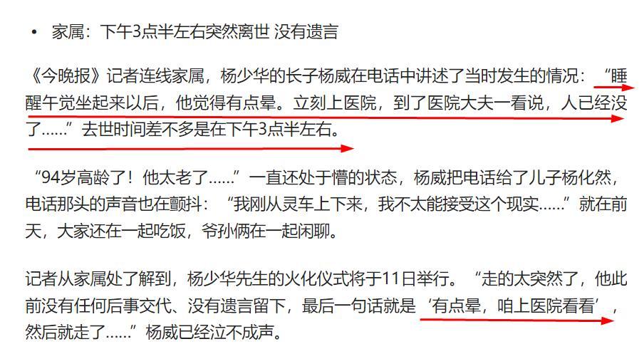 楊少華的大兒子楊威透露了父親去世的臨終細節,他說父親午睡醒來後,感覺有些頭暈,便讓家人將他送往醫院。