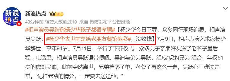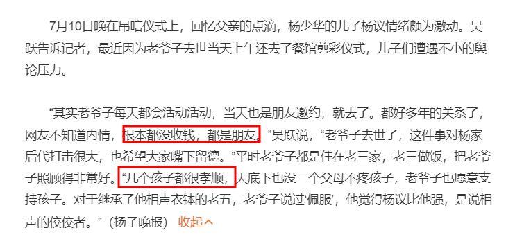 吳躍還提到楊少華的幾個兒子都很孝順,老爺子去世,對他們打擊很大。
