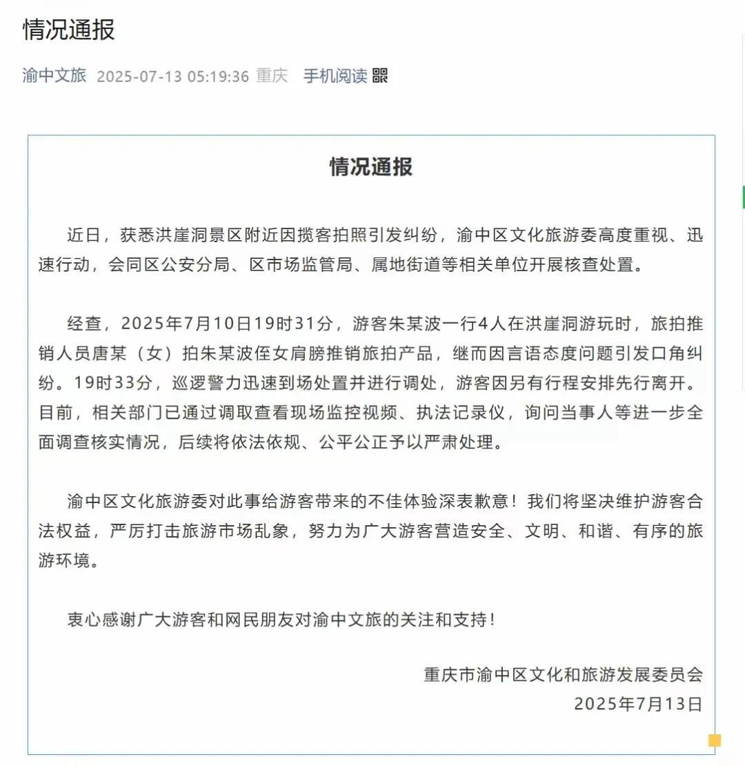 首先,重慶相關主管部門已經知曉此事,已經介入調查,併發布了通報。