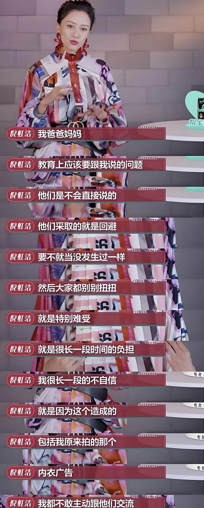 對於倪虹潔拍內衣廣告這件事,她的媽媽和爸爸從來沒有正面跟她溝通過。